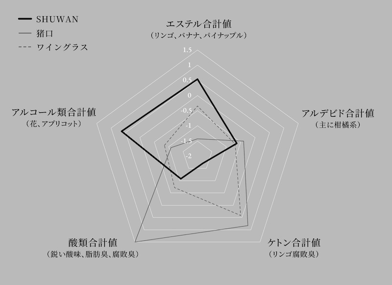 與豬口杯和葡萄酒杯相比,SHUWAN 的蘋果、香蕉等果香成分含量更高。然而,SHUWAN 的異味(酸味和腐臭味)含量低於豬口杯和葡萄酒杯。這些結果表明,SHUWAN 特殊的直徑和高度能夠適當地散發出輕微的異味成分(例如酸味)。此外,其橢圓形和圓形的組合形狀使高沸點成分(酯類化合物)能夠滯留在底部,從而鎖住果香,增強清酒的風味深度。